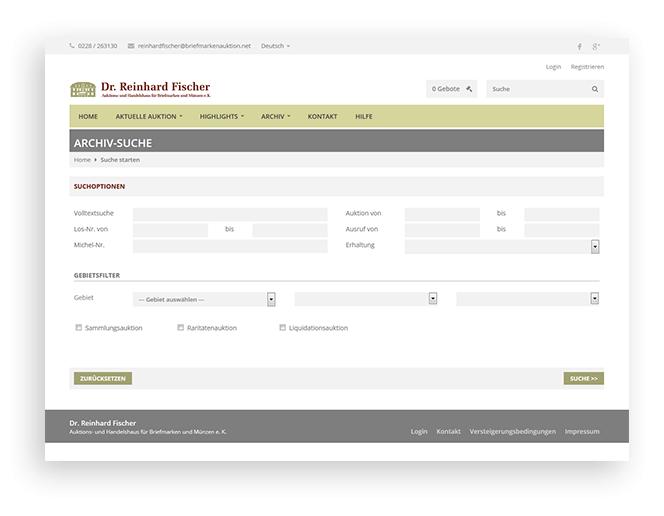 Unser reichhaltig bebildertes Online-Archiv bietet Ihnen eine Fülle an hochwertigen Abbildungen der Lose und Atteste sowie Beschreibungen der meisten unserer vergangenen Auktionen.